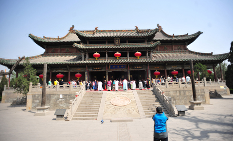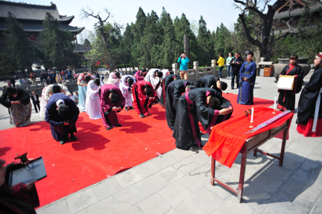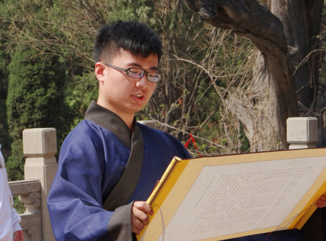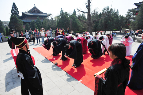 “朝歌汉服社”的30余名大学生们身着汉服在尧庙广运殿前举办:“甲午清明节尧庙祭祀国祖尧帝”活动,共同拜祭上古圣贤帝尧。主要流程有:入场赞曰:“甲午清明祭祀尧帝,现在开始。众祭官入场”到赞礼唱:“恭请尧帝“,参祭者随赞,皆行三拜之礼。上香、进爵、读祝文等议程。