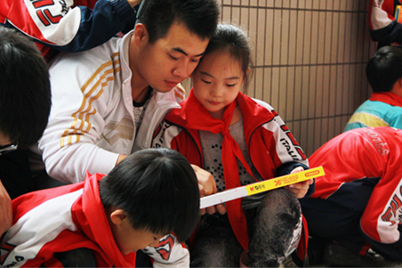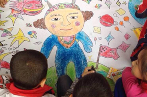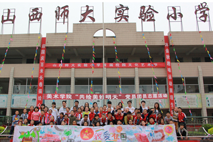 学生与小朋友们合影留念,并用大家共同完成的十二幅巨画作拼成了“六十五”的字样,庆祝国庆65周年。至此,此次活动圆满结束,小朋友和美院的师生结下了深厚友谊,立志要以各位大哥哥大姐姐为榜样,好好学习,早日成为一名合格优秀的大学生。