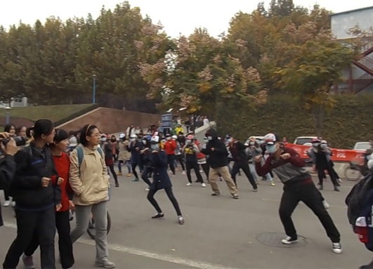 团委组织60余名学生在校园内为大家展示了一场具有时代特色而又别具一格的“快闪”阳光活动。这一活动旨在响应积极响应国家“阳光体育”以及校团委“走下网络、走出宿舍,走向操场——三步走”活动的号召,丰富学生课余文化生活,增强同学们的团队合作意识。为此,院团委携手院青协、美术空间等社团,组织、策划了这一场富有趣味性的特色活动。快闪,即“快闪行动”的简称,是新近在国际流行开的一种趣味活动行为,可视为一种短暂的行为艺术。简单地说就是:许多利用网络联系的人,通过短信或bbs约定一个指定的地点,在明确指定的时间同时做一个指定的引人注意的动作,然后赶快走人。又译“快闪族”、“聪明行动帮”等,称呼五花八门。