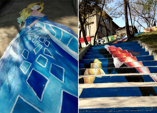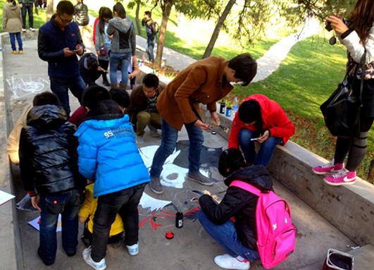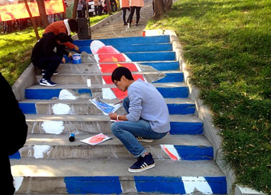 11月16日,院团委及美术空间社团策划、组织100余名学生在莳英园入口阶梯处举办以“缤纷画笔 靓丽校园”为主题的涂鸦彩绘活动,扮靓冬日校园,打造美院特色团日活动,营造丰富校园文化氛围。此次活动根据场地,参与的同学们创作了大量丰富多彩、别具特色、彰显个性的台阶画,主题从字体、人物、动物、到风景等各不雷同。整个过程中,一根根画笔在同学手中灵活的飞舞,一块块鲜明的色彩在墙面上、地面上热情的跳跃,加上现场动感的音乐,飞扬的彩旗,好不热闹。要说最亮点的作品,就要属占据了整整二十多阶台面的3D飞鱼画面。构图上,智慧的小艺术家们,利用每层台阶的立面,从竖向的视觉效果上,拼合出一副具有真实性与立体性相结合的完整画面。画面中四条红白锦鲤相间,穿游飞梭,快速前行,栩栩如生,象征着莘莘学子在激流的学海中奋发激昂、你追我赶的学习势头。精彩的活动吸引了来往众多师生、游客的驻足欣赏及参与,也吸引了临汾新闻、临汾晚报、师大校报等媒体的关注和报道。