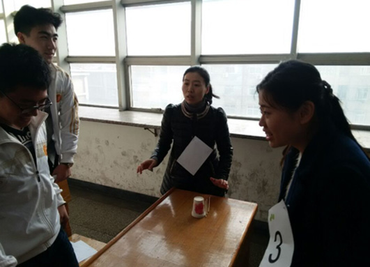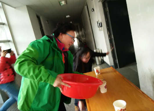 的关怀与爱护。活动共分两个:一是“十号教学楼间的激情奔跑”。该环节以“美丽健康动起来”为口号,采用现今流行的“奔跑吧兄弟”闯关的形式,将女教职工分为红黄蓝三支队伍,依次完成在各楼层设置的游戏关卡,进行闯关。游戏包括“大象鼻子”、“跳绳不是跳绳”“推纸杯游戏”和“寻找有缘人”,各位参赛者在冲关中热情高涨、活力四射,动作敏捷,最终蓝队在闯关中用时最短,获得胜利。