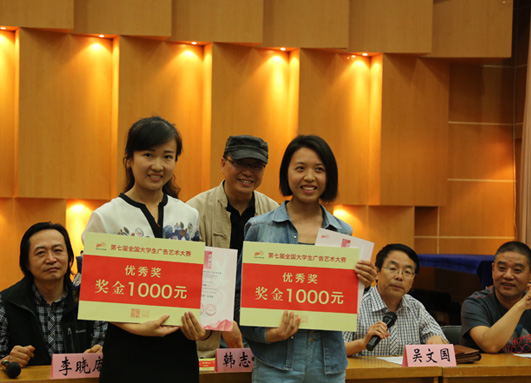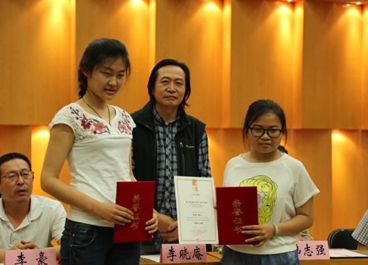 | 韩志强教授为全国大广赛优秀奖获得者秦少梅、李秀媛颁奖 |