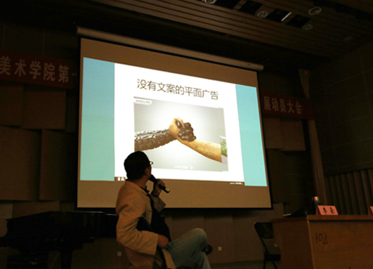 韩志强教授通过一些趣味性的设计方案激发了在场学生对设计的兴趣。韩教授以1至10独特的理念和对设计的理解,从无中生有大智慧、到独一无二想概念、再到接二连三找创意、创意可以说三道四、表现需要四四五五等,无一不在向大家诉说大广赛的核心与内涵。