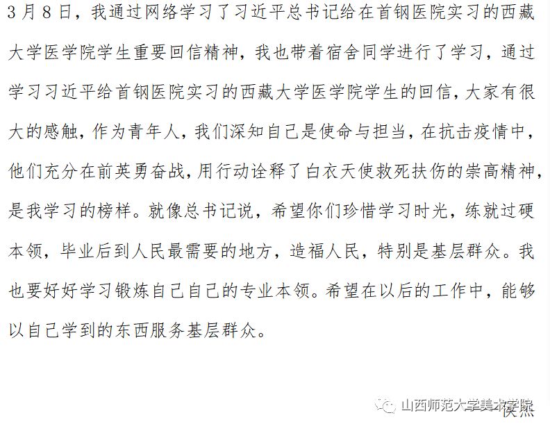 全体学生纷纷表示将牢记习近平总书记嘱托,珍惜学习时光,筑牢理论根基,练就过硬本领,提升实践能力,永葆初心、勇担使命,服务基层、造福群众,为全面打赢防疫攻坚战贡献青春力量!
