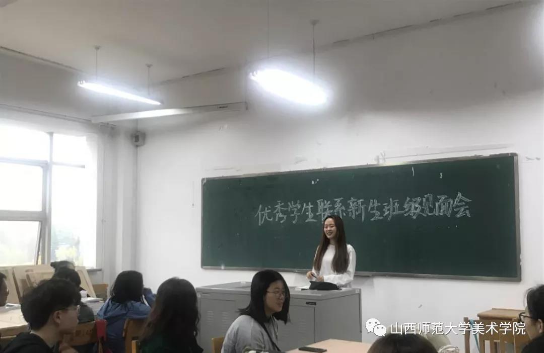 各班级举办了优秀学生联系新生班级见面会。主讲人有:2017级设计专业成功推免研究生的郭晓敏、卫茹、任晓希3位同学及美术学专业优秀学生代表李星宣,分享主题主要是保研经验及学习规划。