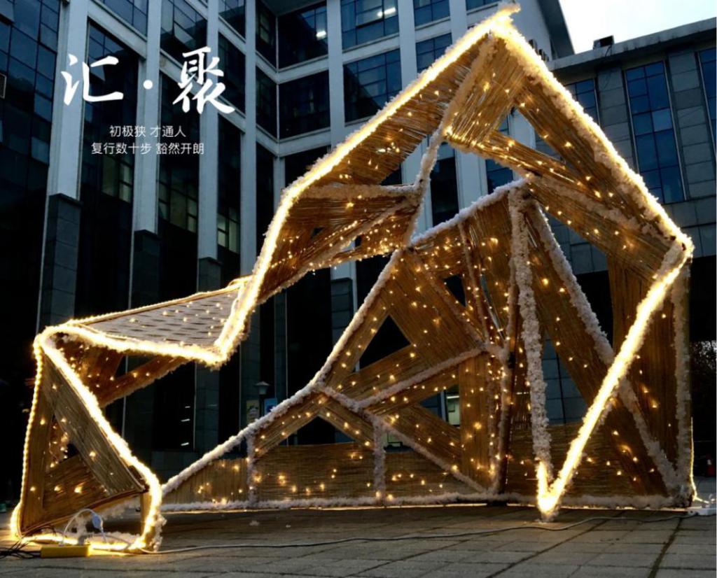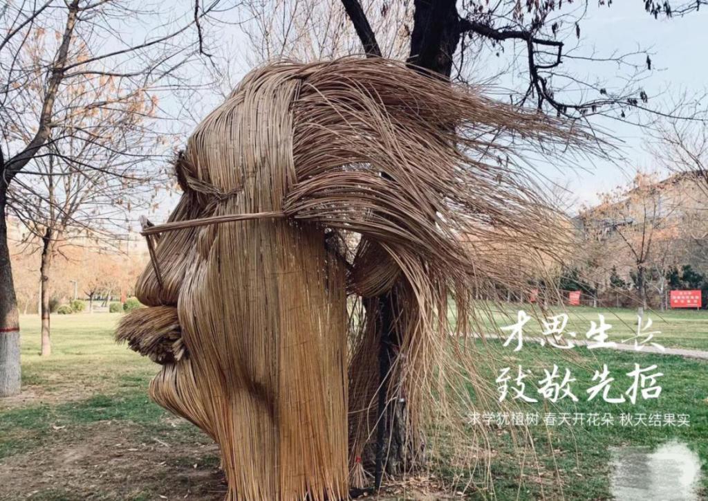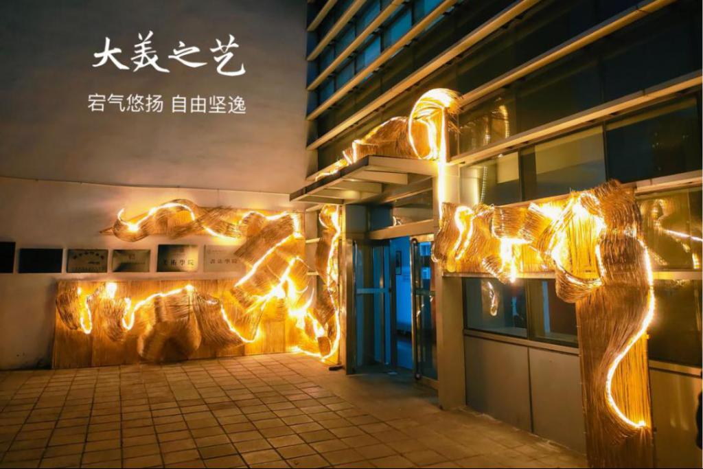 院徽元素与传统柳编工艺相结合,以装置艺术的线面要素 营造出一种渐变空间丰富的律动感与层次感,以学科服务校园景观,创新民间传统工艺,共建美丽校园。非遗入校,熠熠升徽。