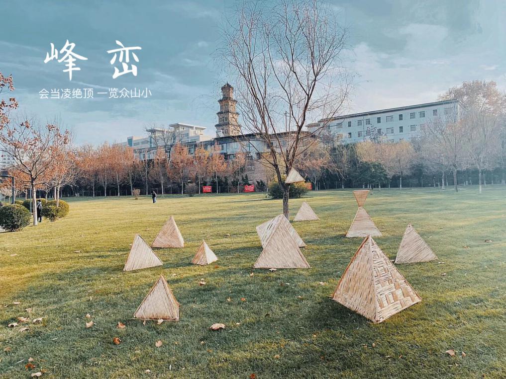 作品以山峰为形象来源,柳条与三棱锥形体相结合,在空间中自由组合不同的空间形态。传达出大学生攀登高峰,一览众山的奋进精神与自由的追求。