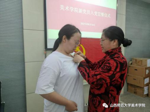 党委委员为新党员佩戴了党员党徽;全体党员肃立面对党旗,在研究生第一党支部组织委员梁琪同志的带领下庄严宣誓。铮铮誓言代表了全体党员对党最忠诚的决心。与会的各位老党员一起参加了宣誓。