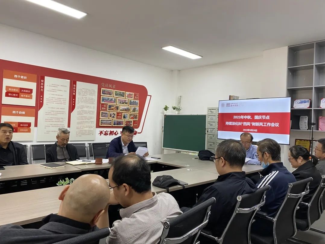 全体教师在艺馨苑会议室召开2023年中秋、国庆节点持续深化纠“四风”树新风工作会议。
