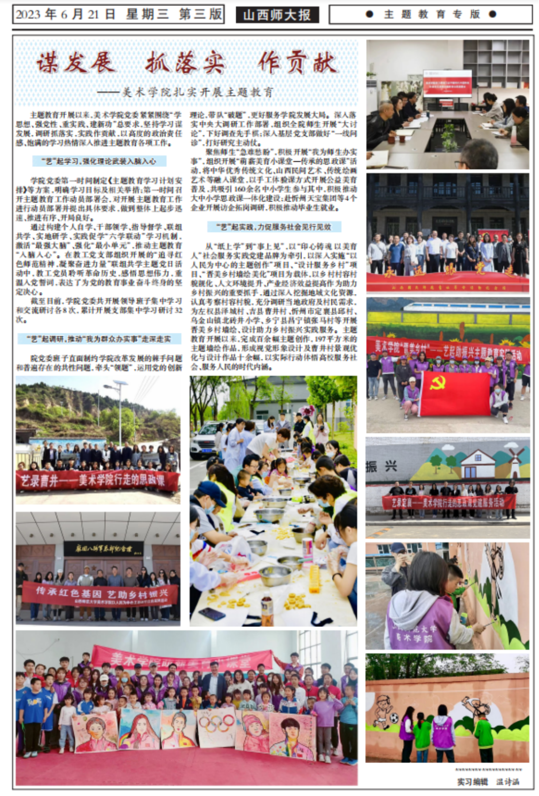 从“纸上学”到“事上见”,以“印心铸魂 以美育人”社会服务实践党建品牌为牵引,以深入实施“以人民为中心的主题创作”项目、“设计服务乡村”项目、“晋美乡村墙绘美化”项目为载体,以乡村村容村貌靓化、人文环境提升、产业经济效益提高作为助力乡村振兴的重要抓手,通过深入挖掘地域文化资源,认真考察村容村貌,充分调研当地政府及村民需求,为左权县泽城村、吉县曹井村、忻州市定襄县邱村、乌金山镇北砖井小学、乡宁县昌宁镇张马村等开展晋美乡村墙绘、设计助力乡村振兴实践服务。主题教育开展以来,完成百余幅主题创作,197平方米的主题墙绘作品,形成视觉形象设计及曹井村景观优化与设计作品十余幅,以实际行动体悟高校服务社会、服务人民的时代内涵。