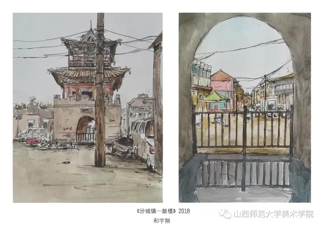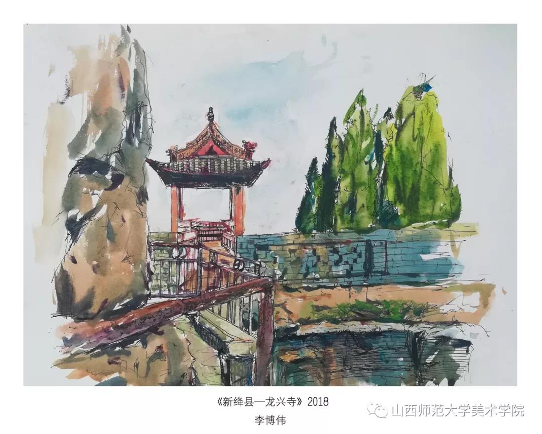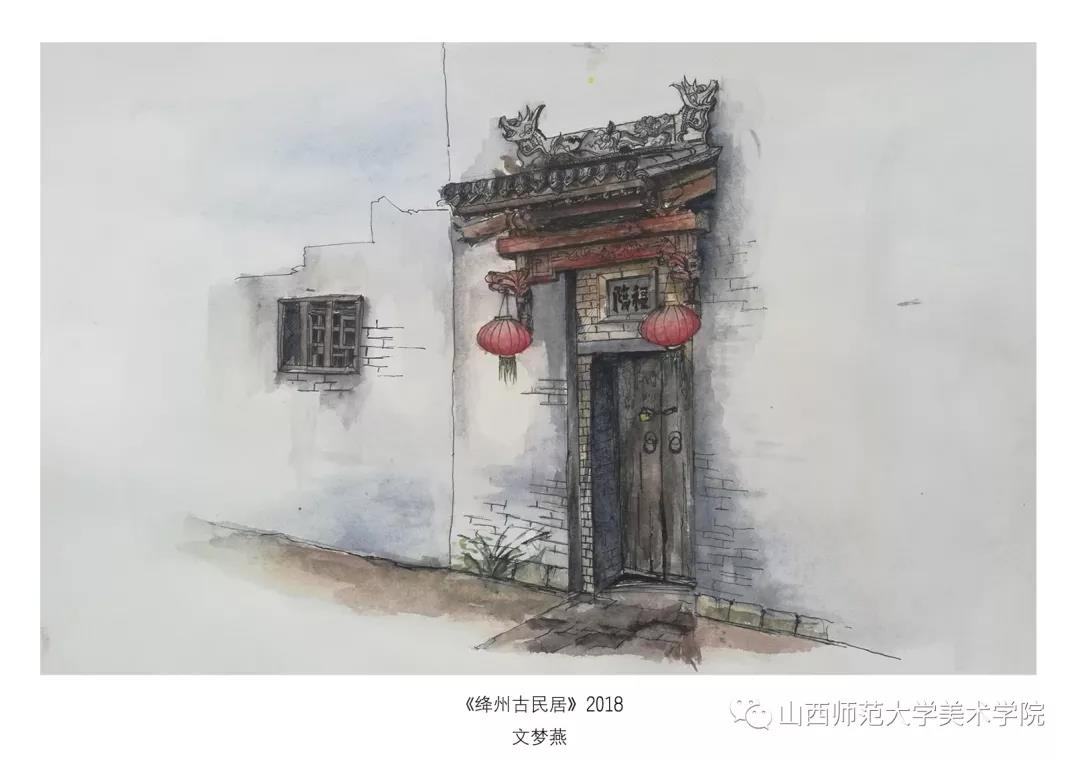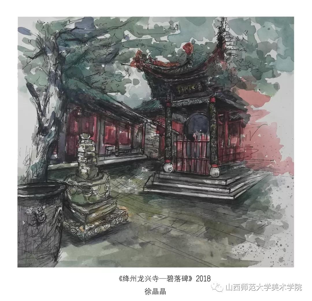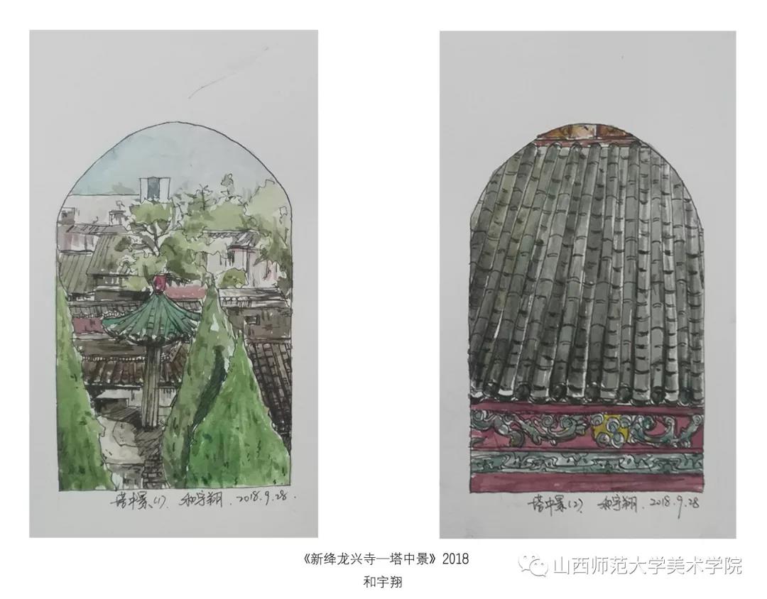 考察作业要求为古建筑及建筑装饰钢笔速写或者钢笔(铅笔)淡彩。实习过程中,大部分同学都能认真的去完成写生,从最后的作业呈现和我每日的观察来看,可能是环艺专业绘画实践较少的原因,同学们在造型、色彩、构图能力还存在或多或少的问题,有的同学是造型能力有限,有的同学是对钢笔淡彩的材料和技法还无法掌控,有的同学是专注与用心程度不够。