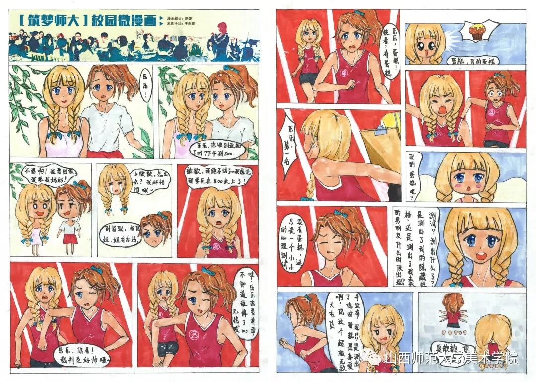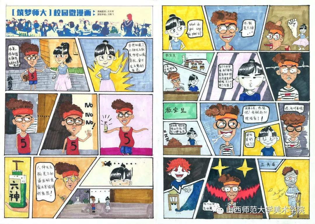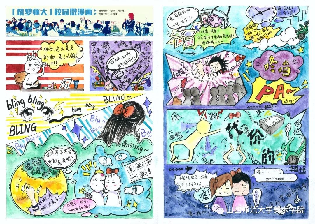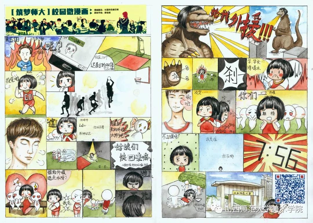 17级视觉传达班在《插画设计》课程上的结课作业。所有作品从故事脚本到漫画表现都来自同学们的亲手原创。在漫画中,我们看到师大的篮球赛,啦啦操训练、合唱比赛、社团活动、上课时的糗事、宿舍中的囧态……这些漫画故事都取材自同学们生活中真实发生的小状况,是不是代入感十足?