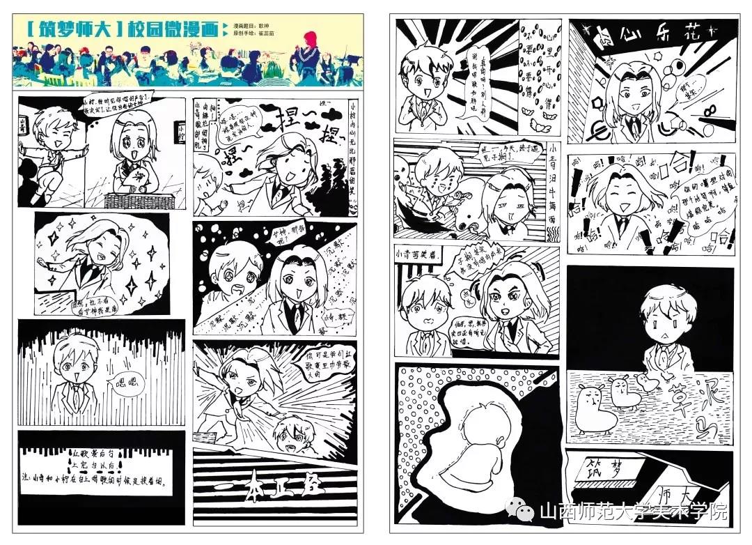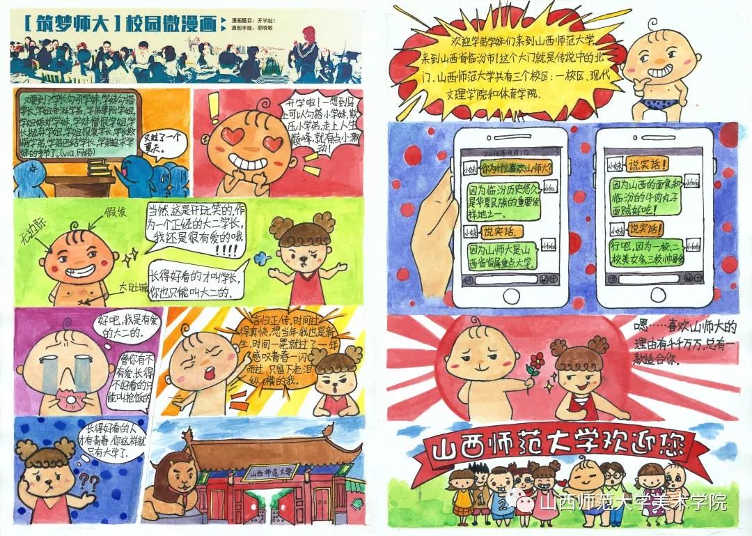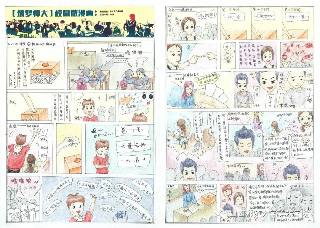在17级视觉传达专业的《插画设计》课程中,《插画设计》课堂教学改革课题组接到山西师大60周年校庆主题的艺术创作项目,经过研讨,导师们决定将两种创作方式引入《插画设计》课堂教学,一是“筑梦师大”校园微漫画,主题性多格漫画原创绘制。二是“创新奋进 筑梦师大”大型拼贴海报的课堂创作。