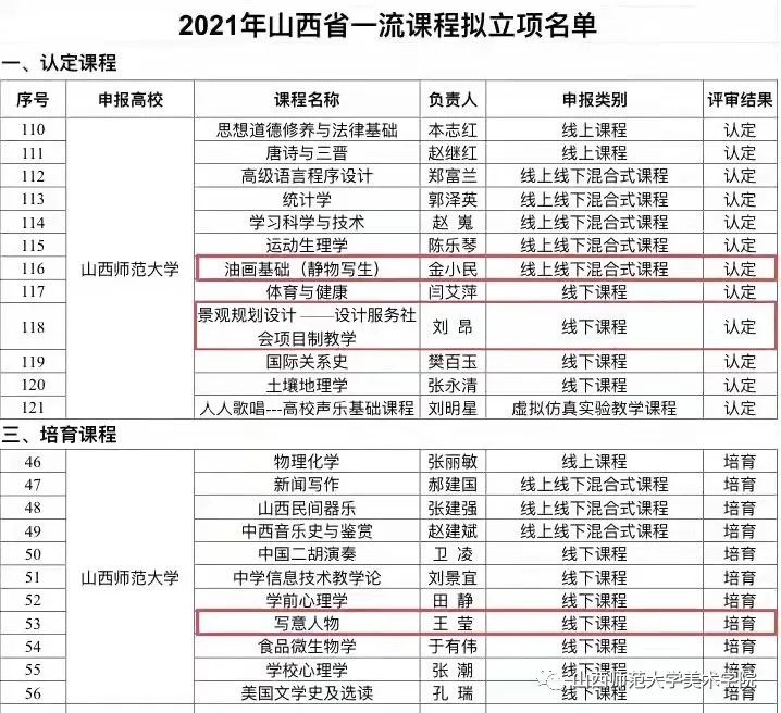 院长金小民教授《油画基础(静物写生)》获批山西省线上线下混合式一流课程;王莹副教授《写意人物》获批山西省线下培育课程;青年教师刘昂《景观规划设计—设计服务社会项目制教学》获批山西省线下一流课程。