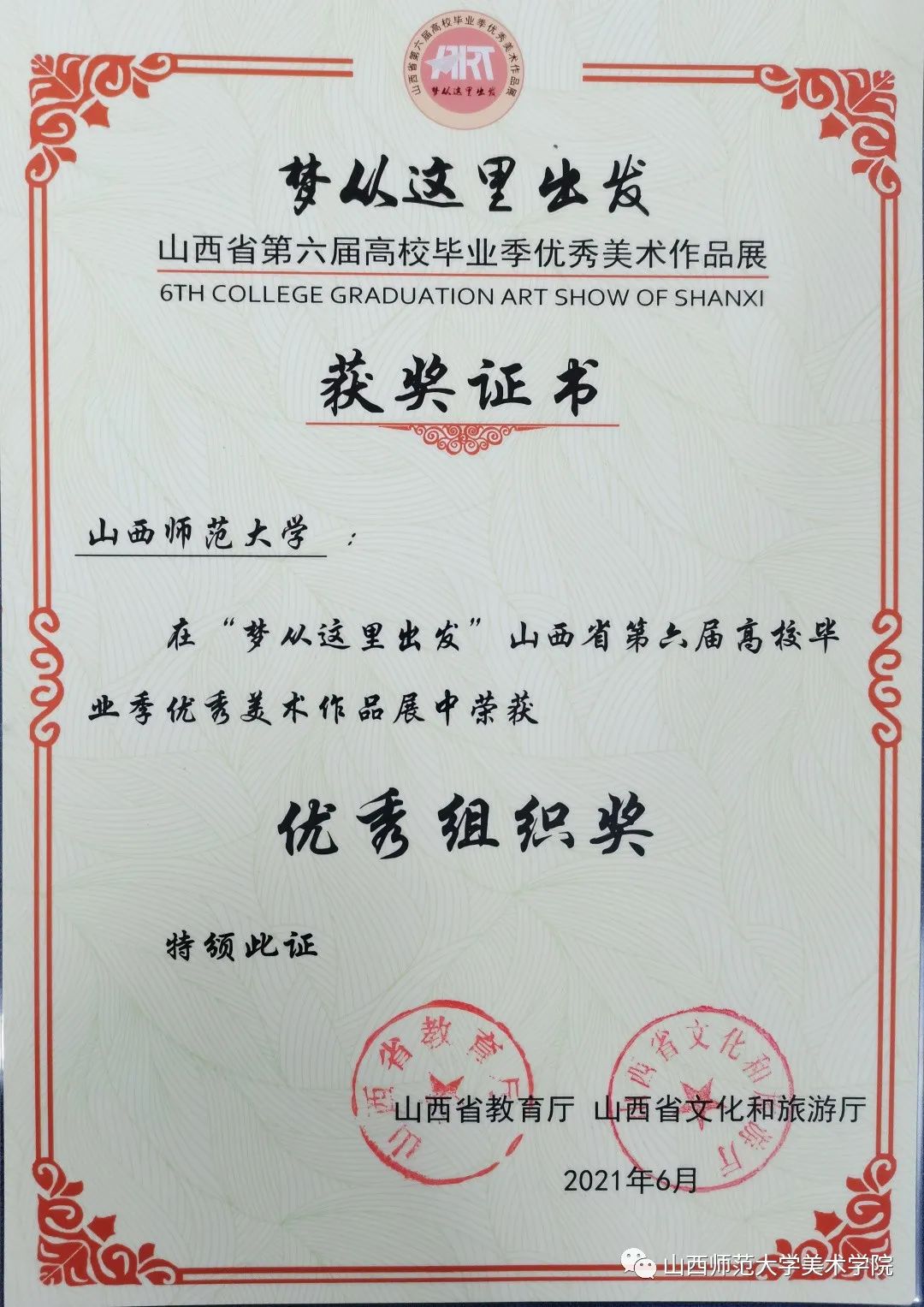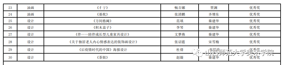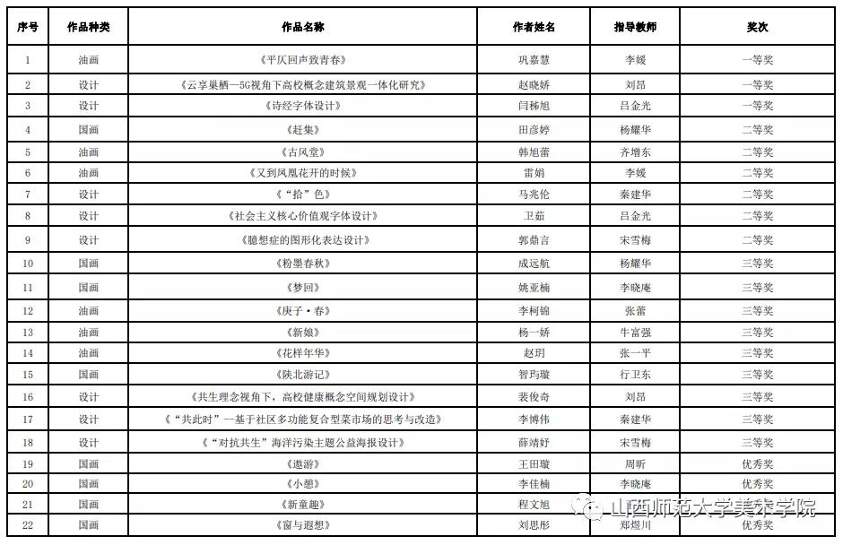 本届美展分为毕业作品展、“三晋艺彩 晋艺传承”工艺美术及非物质文化遗产主题展览两个展览板块,展览共有56所高校参加,共征集到作品1200余幅(件)。我校师生作品最终在本届毕业季美术作品展中荣获一等奖3项、二等奖8项、三等奖12项、优秀奖12项。