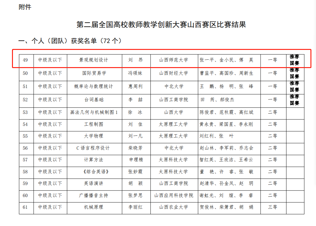 进一步推动高等教育教学改革创新、提升高校教师教学水平和育人能力,引导广大教师潜心教书育人,教育部高等教育司举办第二届全国高校教师教学创新大赛。大赛分为国赛、省赛和校赛三级赛事。山西省教育厅于2022年5月6日-7日承办了山西赛区赛事,赛事分为正高组别、副高组别、中级及以下组别。打游戏赚钱 教学团队刘昂、张一平、金小民、傅昊老师主讲的《景观规划设计》课程,于1月份在校赛初选以校级第一名的成绩推荐参加省赛,并在5月6日的山西赛区中喜获中级及以下组别一等奖的佳绩,是我校唯一被推荐参加国赛的教学团队。