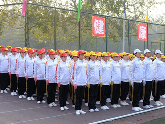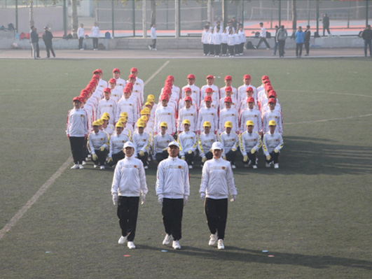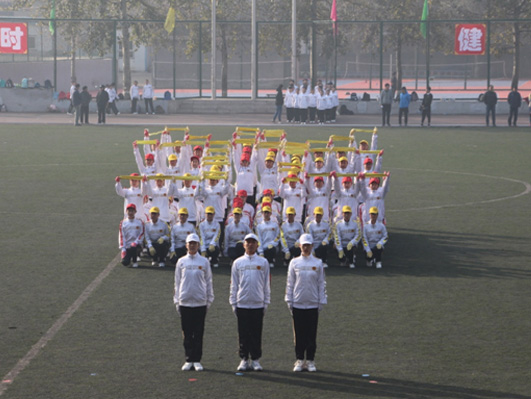 别出心裁,独具匠心。同学们头戴红色和黄色的帽子、分别组成“阳光”二字,象征着重视和积极贯彻阳光体育政策。在赛场上,同学们经过改良装饰的服装熠熠生辉、洋溢着青春的气息,整齐的动作张弛有度,振奋昂扬的精神青春蓬勃,尽情展现着美院大学生动人的神采。他们力聚力、心凝心,团体的意识也在无形中显露,宛如110只齐飞的雄鹰,翱翔在无边的天际。