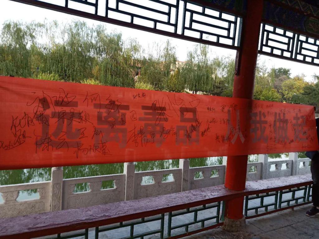 2018年10月19日,1804班团支部于10509教室召开了10月份主题团日筹备会,10月20日下午于山西师范大学莳英园举办了此次团日活动。通过两部分大家宣传禁毒:举办毒品知识竞赛、班长领学禁毒防毒知识。这不仅增强了同学们对毒品的认识,还提高了防毒意识。随后组织全体支部成员于“珍爱生命,远离毒品"横幅上签字,面对横幅庄严宣誓,表达同学们拒毒防毒的决心。