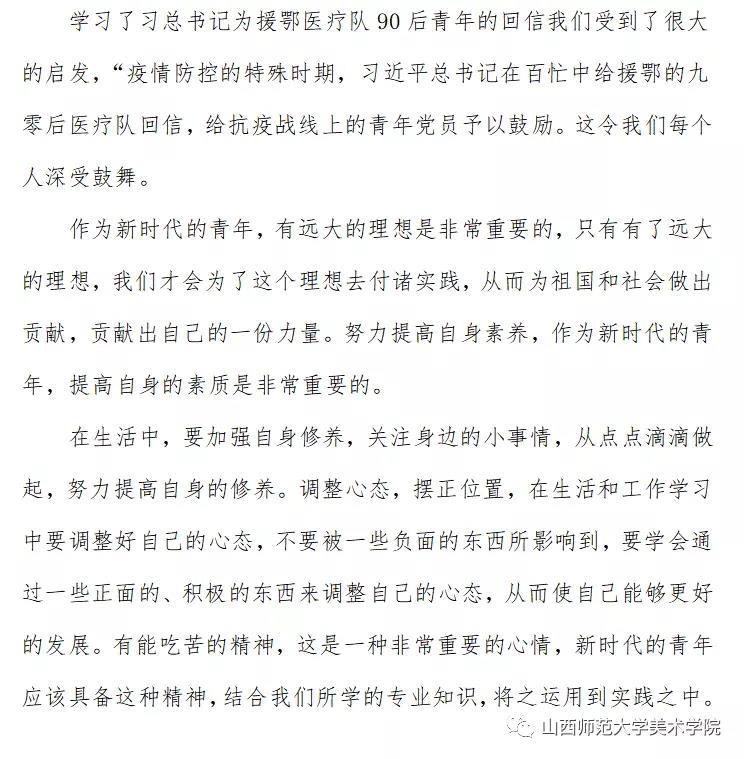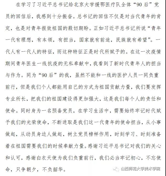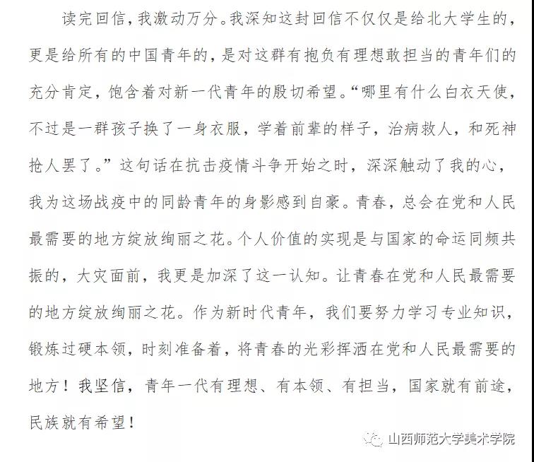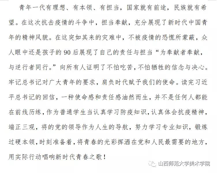 习近平在回信中表示,在新冠肺炎疫情防控斗争中,你们青年人同在一线英勇奋战的广大疫情防控人员一道,不畏艰险、冲锋在前、舍生忘死,彰显了青春的蓬勃力量,交出了合格答卷。广大青年用行动证明,新时代的中国青年是好样的,是堪当大任的!