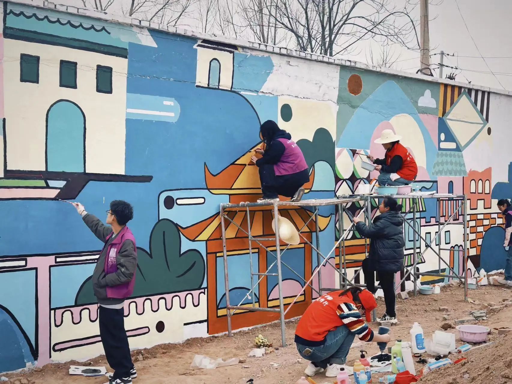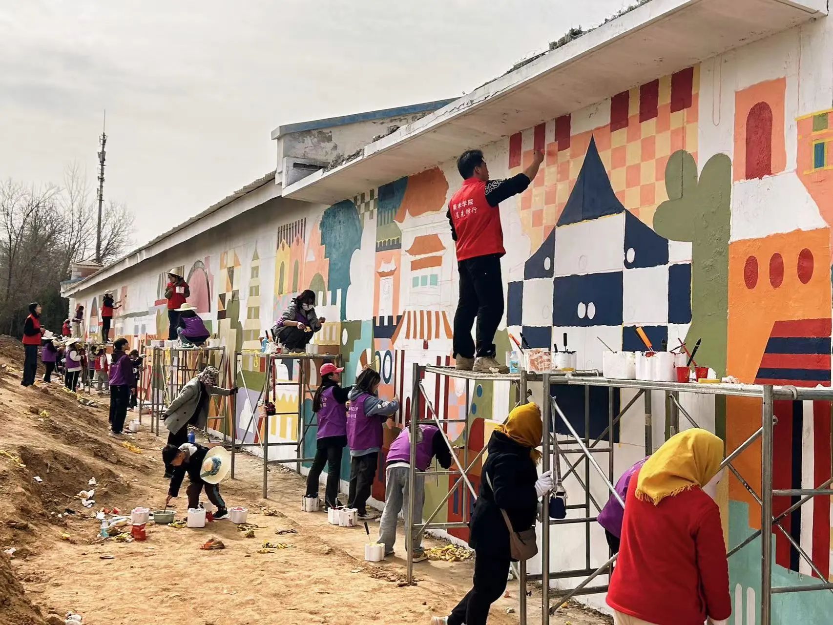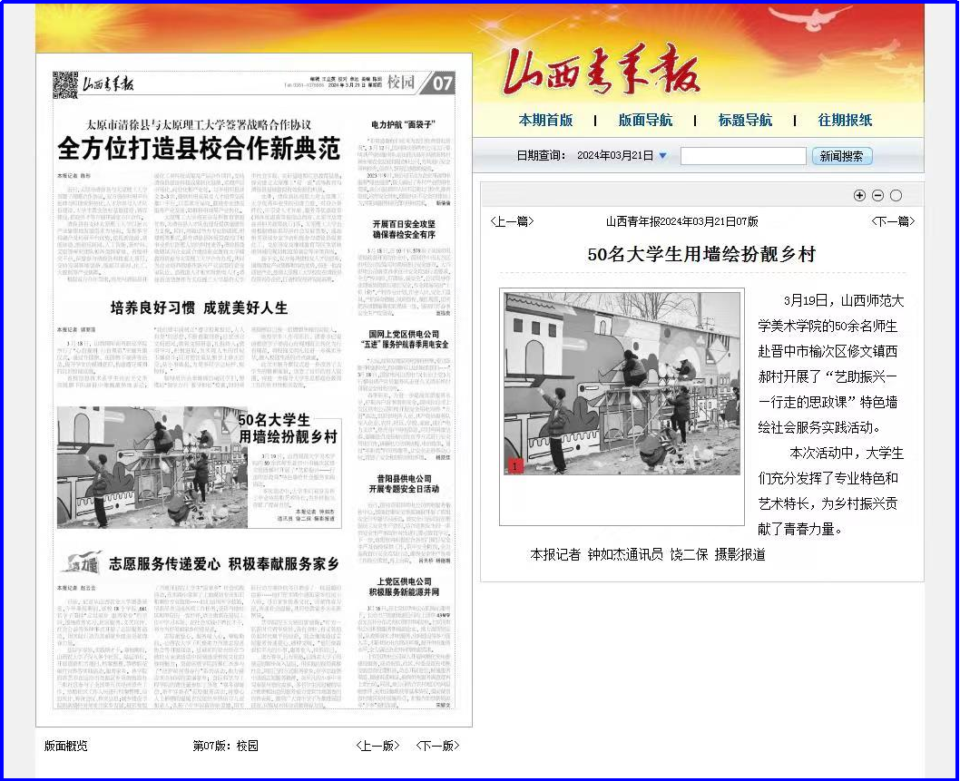 组织师生艺术服务队赴晋中市榆次区修文镇西郝村开展了“艺助振兴——行走的思政课”特色墙绘社会服务实践活动,完成乡村靓化提升彩绘500余平米。