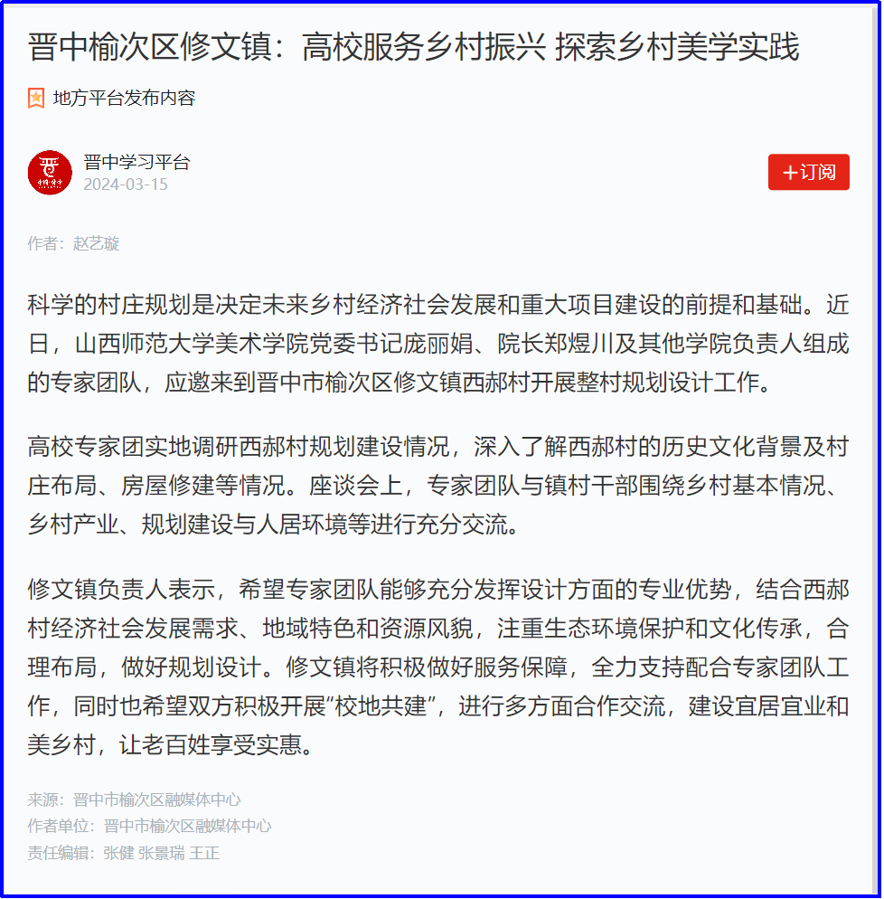 将坚持发挥专业特色,持续用艺术赋能乡村振兴,在三晋大地上上好“行走的思政课”,为建设宜居宜业和美乡村贡献智慧力量!